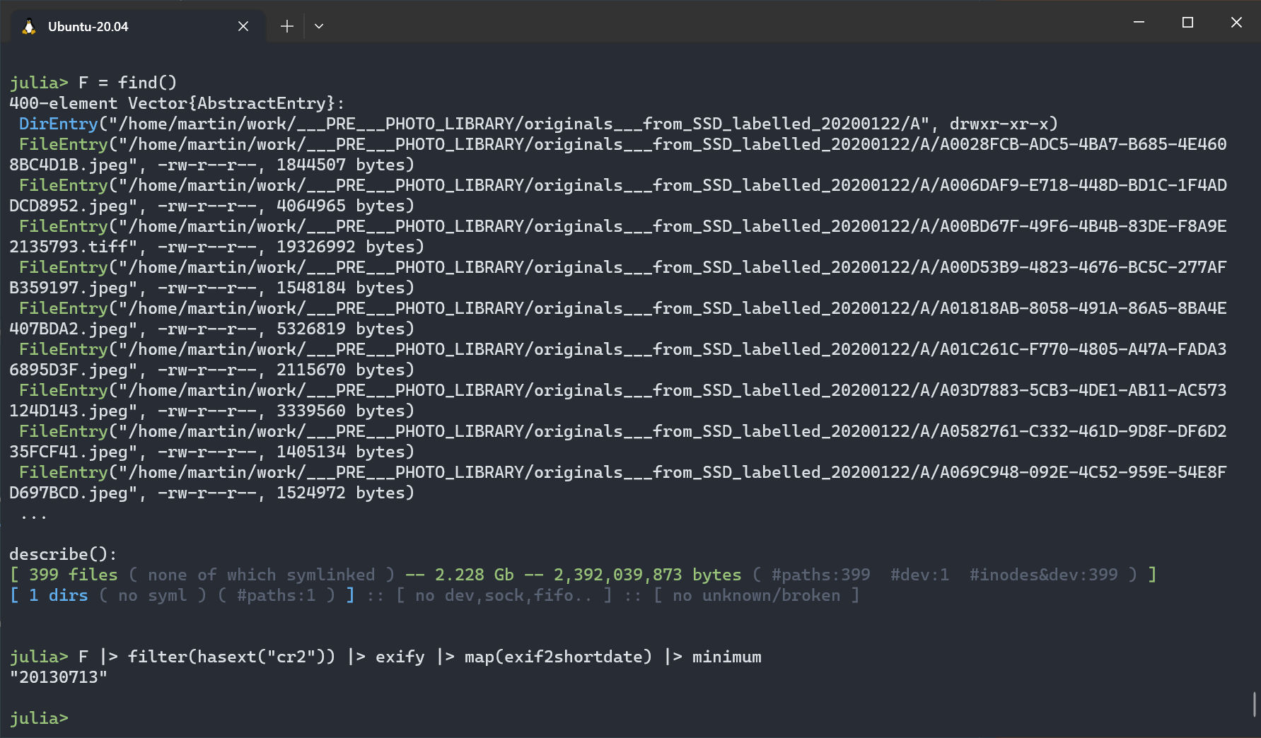 Exifuse uses the command line - the Julia REPL - to browse and inspect large number of files. Let's try to pinpoint when we stole our Canon kit: